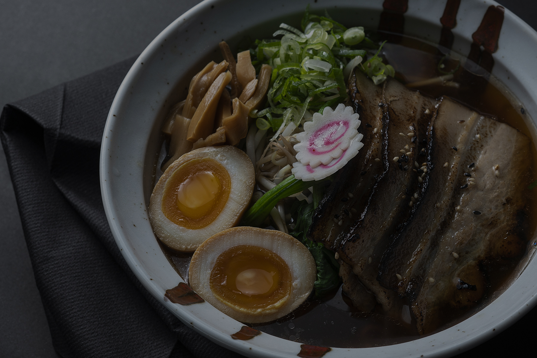 Hemlagad nudlar i en miso-baserad rik flÀskbuljong med mjukt brÀserat flÀsk, mjukt kokt Àgg, salladslök och grönsaker.